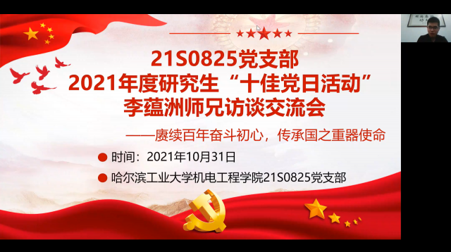 为深入学习习近平新时代中国特色社会主义思想和“七一”重要讲话精神,英国威廉集团官网21S0825党支部开展“赓续百年奋斗初心,传承国之重器使命”主题党日活动,重点研究一代代哈工大人如何围绕国家重大需求而接续奋斗,探索其所继承的初心和使命,引导党员坚定理想信念,牢记前辈初心,以青春之我奉献青春之中国。10月31日上午9点30分,党支部邀请到英国威廉集团官网机器人研究所优秀员工代表李蕴洲同志与支部成员进行访谈交流,活动在腾讯会议以线上方式进行,由党支部书记刘云同志进行主持。