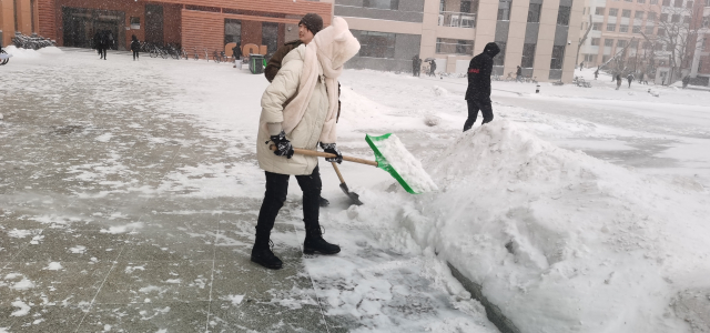 中午12:00,英国威廉集团官网2020级本科生扫雪先锋队在B栋门前手持扫把、铁锹,待公寓领班阿姨划分扫雪区域后,就立马投入到扫雪中去。尽管天气严寒,气温很低而且伴随着大雪纷飞,但面对诸多困难,全体先锋队员不为困难所动,挥动着铁锹等劳动工具清扫积雪,齐心协力,配合默契,铲的铲、扫的扫,忙碌的身影构成了一道亮丽的风景线。在消除安全隐患的同时,也方便了广大师生。