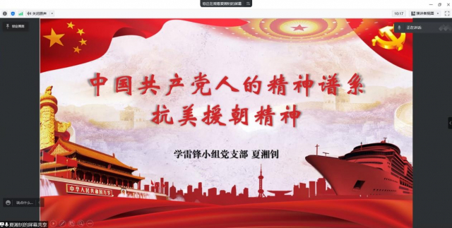 会议第二项,由组织委员夏湘钊同志主讲《中国共产党人的精神谱系之抗美援朝精神》主题微党课。夏湘钊同志从“抗美援朝精神的内涵”“构建人类命运共同体”“一个红星笔记本的故事”三个角度进行讲解。首先,将抗美援朝精神剖析为五个主要层次,即以爱国主义为根本、革命英雄主义为精髓、革命乐观主义为特质、革命忠诚主义为底蕴、国际主义为有机组成部分,并用凝练的语言分析了它们的精神内核。随后,展示了人类命运共同体这一理念的提出与发展历程,并指出构建人类命运共同体是大势所趋,将引领人类进步的潮流。最后,以哈工大员工连家创先生的红星笔记本收束全篇,勉励青年学子树立光辉榜样、培养崇高精神,向着全面建设社会主义现代化国家新征程,向着实现中华民族伟大复兴的中国梦继续奋勇前进。