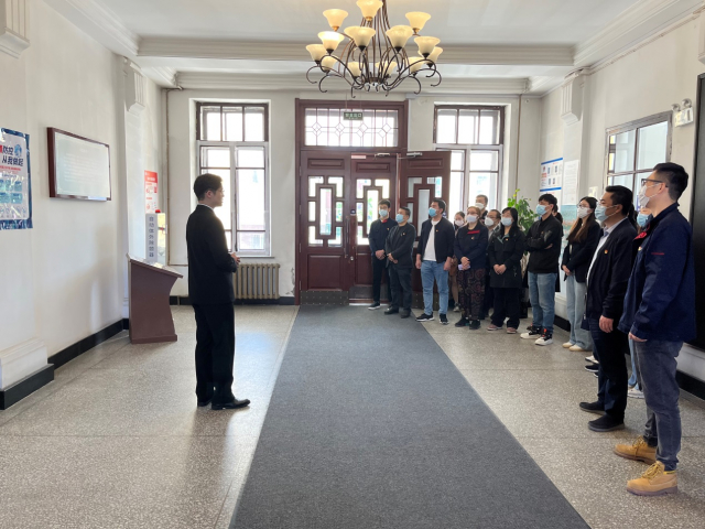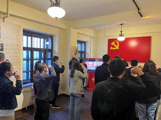 见学点的讲解员同学首先为大家介绍了校部楼的历史及它在抗日时期发挥的重要作用。之后,大家依次参观了展板长廊、复原的早年员工宿舍、历史资料室等展厅,聆听了哈工大的一个个红色故事。通过墙上的老照片和展柜中珍贵的展品,大家充分了解了学校的红色峥嵘历史和学子们矢志爱国的革命传统。在参观的最后,全体党员对着党旗庄严宣誓,重温入党誓词。